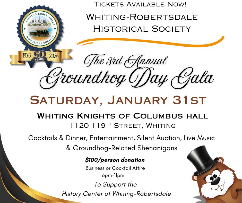 Join the City of Whiting at the Whiting Knights of Columbus this Saturday for the annual Groundhog Day Gala. The gala benefits the Whiting-Robertsdale Historical Society and its new History Center, so you can have a good time while supporting a good cause when you purchase a ticket. Tickets are available online. Learn more here.