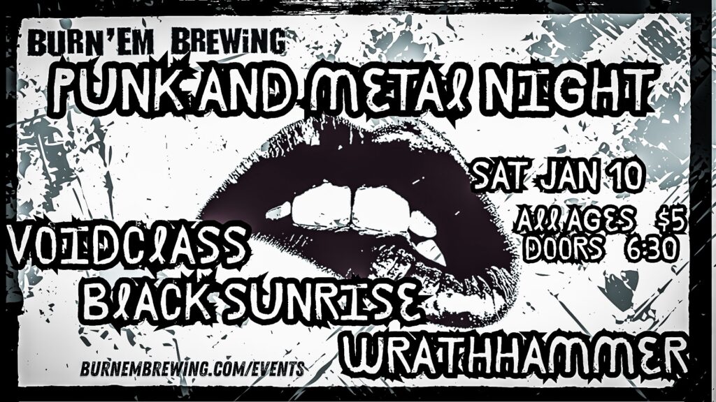 Burn ‘Em Brewing has brought together the loudest of the loud local bands for a powerful evening of guitar solos, moshing, and getting to know your community. Punk & Metal Night will feature Voidclass, Black Sunrise, and Wrath Hammer and is sure to melt some faces. This show is all ages, tickets available online. Learn more here.