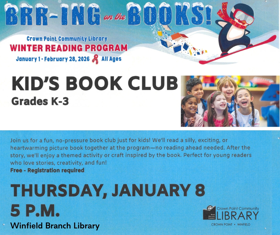 The Crown Point Community Library is hosting a fun, no-pressure book club for young children this Thursday as part of its Winter Reading Program. Children will do a guided reading of a book in the library followed by a themed activity that helps encourage reading comprehension and teaches children that reading can be fun. The event is free to attend, but registration is required. Learn more here.