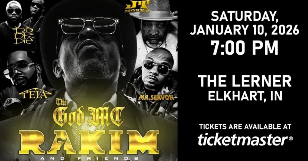 Get to know the man who invented flow in rapping at the Lerner Theatre this Saturday! With his laidback but complex delivery and lyrics, Rakim revolutionized the world of hip hop, and you can see how at An Evening with Rakim at the Lerner. Included with your ticket are performances by Do or Die, JT Money, Mr. Serv On, and Tela! Tickets available online. Learn more here.