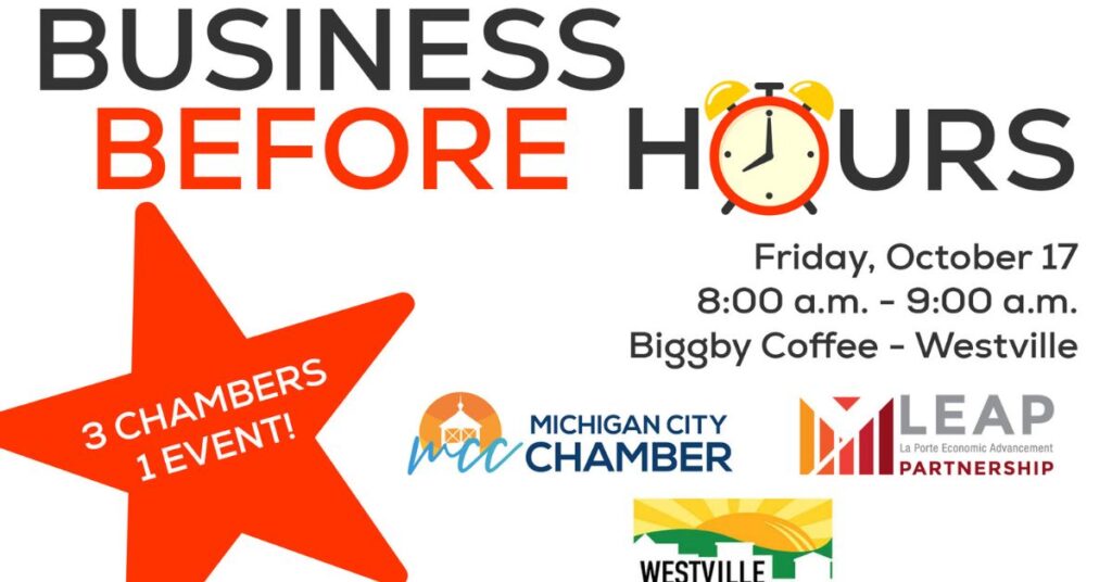 Early risers are in for a real treat this Friday at Business Before Hours! Sit down with the La Porte Economic Advancement Partnership, Michigan City Chamber, and the Westville Area Chamber of Commerce at Biggby Coffee in Westville at this first-of-its-kind event. Connect with the community members bringing growth and development to your home. Learn more here.