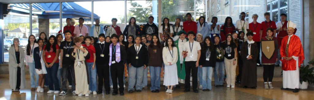 Freshman theology students celebrated All Saints Day by dressing up as various saints and writing a paragraph of why they chose each saint. Students were encouraged to save money and use items that they already had.