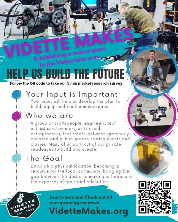 Vidette Makes, a Valparaiso based nonprofit, has set their sights on opening a physical location to host a makerspace and classroom. The group started as a small band of friends meeting monthly to discuss creative, technology based ideas. Before long they identified a need within the community for a shared space where group members could gather and make their ideas into reality. Fast forward through the pandemic years and the group has made significant strides. Officially established as a 501C3 nonprofit in 2020, they continue to grow in numbers and are steadfast on acquiring a physical location. The president of Vidette Makes, Adam Johnson, and some associates continue fine tuning the proposed business plan and have launched a market research survey at videttemakes.org that they would love the readers of this article to participate in. Meanwhile, Chad Copeland the vice president and director of programs and events for Vidette Makes has nearly booked the entire year’s upcoming events. The schedule includes: field trips to places like Urschel Labs, Valpo Hot Shop, and Snake River Forge blacksmithing studio. Other events like a quarterly Show & Tell, and their main event the “Makers’ Monthly Meetup” are fantastic ways to make friends and learn about what members of the group are building and are interested in. All events are currently open to the public via RSVP on Meetup.com.