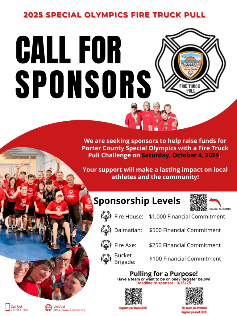 Community members are invited to form teams of 10 and raise $750 per team to compete in the ultimate show of strength and teamwork—pulling a fire truck! A special prize awaits the winners (to be revealed soon). All proceeds benefit Porter County Special Olympics.