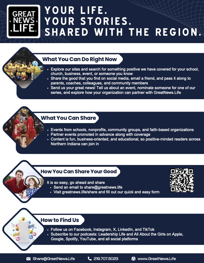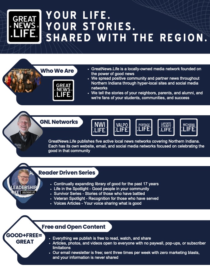 GreatNews.Life is dedicated to sharing the good news happening throughout the Northwest Indiana and Michiana regions. In 2025 alone, we added over 3,000 articles and 90,000 photos to our free digital library, making it the largest library of good for the last 16 years.