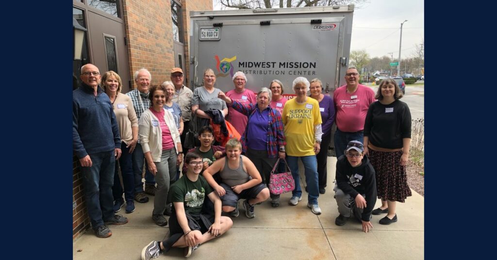 Featured image: A portion of the workers posing after the 4,000 bags that will feed 24,000 people in Ukraine are loaded and headed for the Midwest Mission Distribution Center and ultimately to New York for shipment overseas More than 125 members of First …