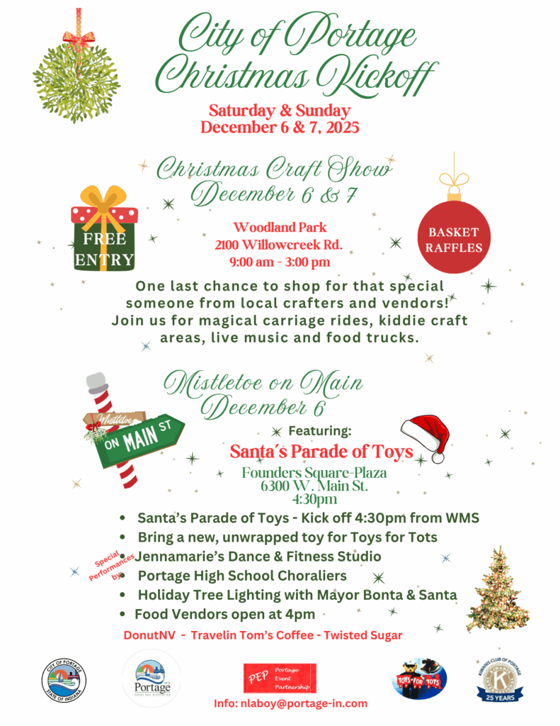 Portage Event Partnership along with the Portage Kiwanis will present Santa’s Parade of Toys and the annual Tree Lighting with the Mayor and Santa on December 6!